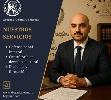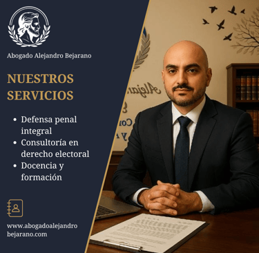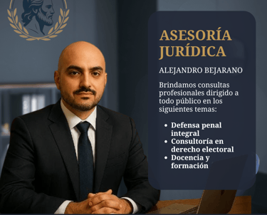 La misión de Alejandro Bejarano García es ofrecer un servicio jurídico integral y especializado en tres ámbitos fundamentales: la defensa penal y penal militar, mediante estrategias técnicas y éticas que aseguren la protección de los derechos fundamentales y la búsqueda de resultados justos; la consultoría en derecho electoral, orientada a garantizar que candidatos, partidos y organizaciones políticas actúen en estricto cumplimiento de la normativa vigente, fortaleciendo así la legitimidad democrática; y la asesoría académica en Derecho, Ciencias Militares y áreas afines, proporcionando acompañamiento riguroso en trabajos de grado, investigación y formación profesional. Todo ello bajo un enfoque de excelencia, compromiso con la verdad jurídica y responsabilidad social, consolidando un ejercicio profesional que une práctica legal, visión estratégica y aporte académico al servicio de la sociedad.
