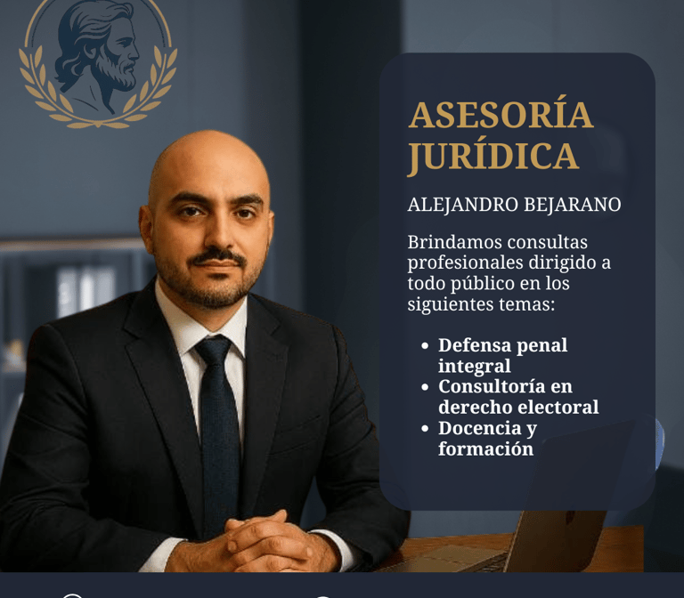 Alejandro Bejarano García es un abogado colombiano con sólida experiencia en representación penal y penal militar, consultoría en derecho electoral y asesoría en trabajos de grado en Derecho, Ciencias Militares y áreas afines. Se distingue por ofrecer una defensa técnica y estratégica en los procesos judiciales, asesorar a campañas y candidatos en el cumplimiento de la normativa electoral y orientar investigaciones académicas con rigor metodológico y respaldo jurídico especializado. Su trayectoria lo consolida como un profesional integral que combina práctica jurídica, visión estratégica y compromiso académico.